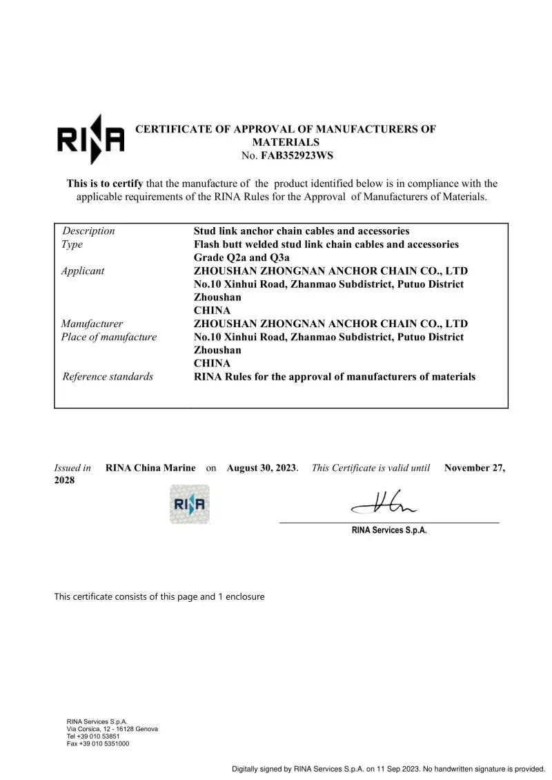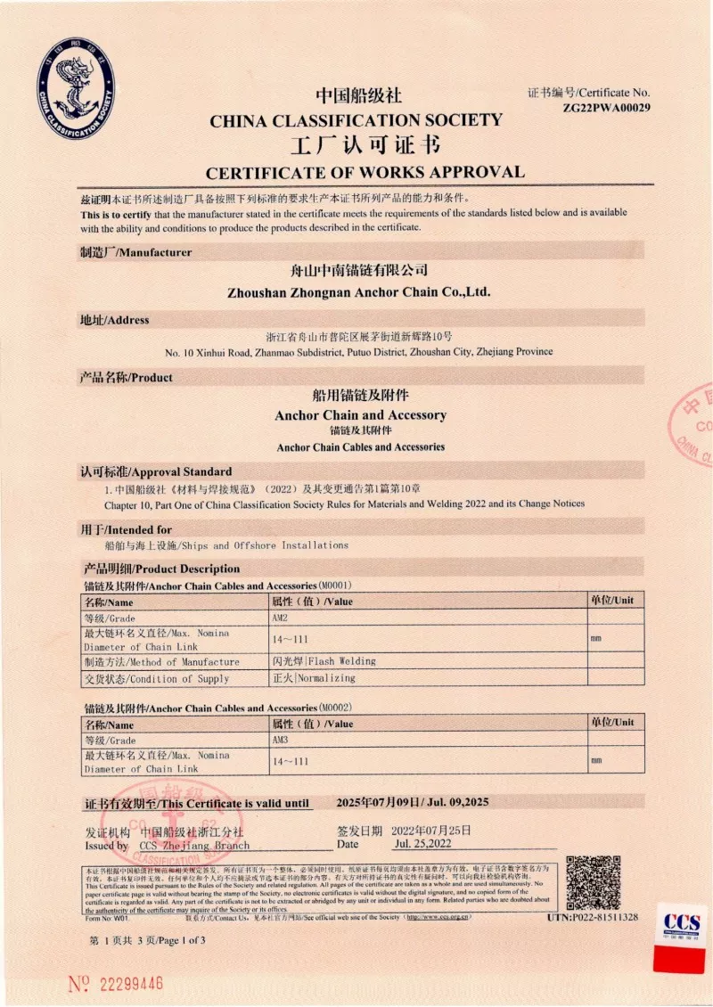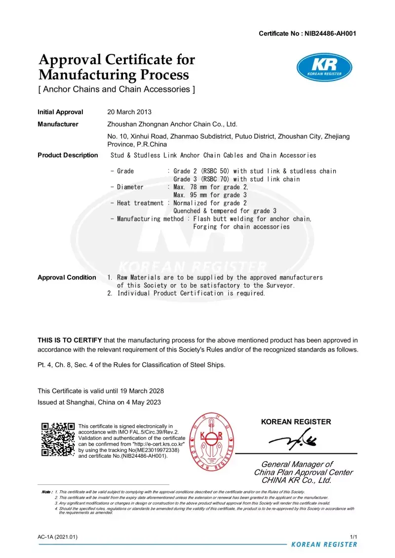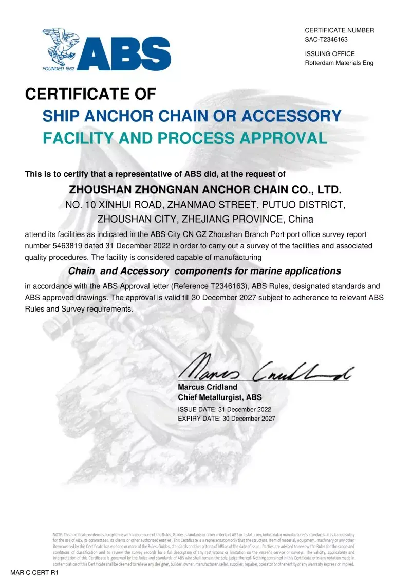Igen. Az összes horgonylánc -tartozékot ugyanazon nemzetközi szabványoknak megfelelően gyártják, amelyek maguk a horgonyláncokra (ISO, IACS) vonatkoznak, beleértve a CCS, ABS, DNV, LR, BV, NK, KR, Rina és RS jóváhagyásait. Ezek a tanúsítások biztosítják, hogy a kiegészítők megfeleljenek a globális hajógyártók és az offshore operátorok dimenziós pontosságának, biztonságának és mechanikai erősségének követelményeinek.