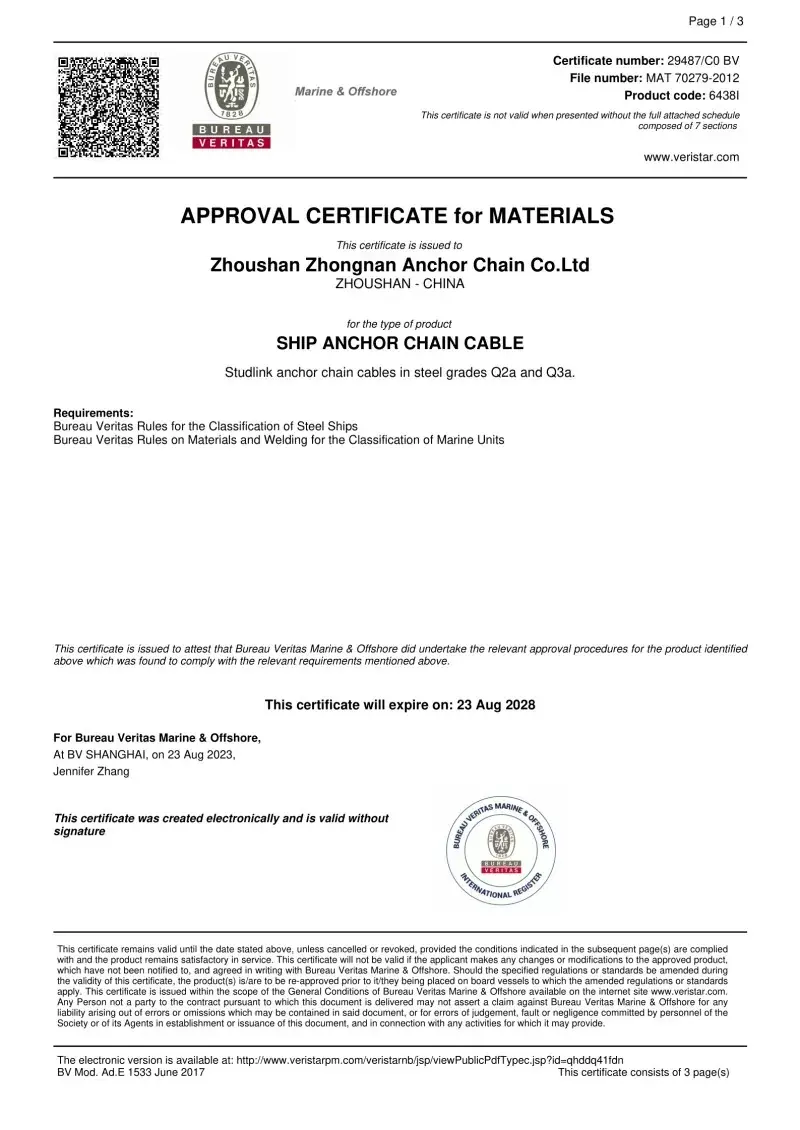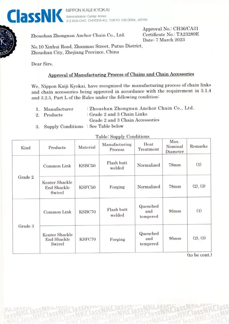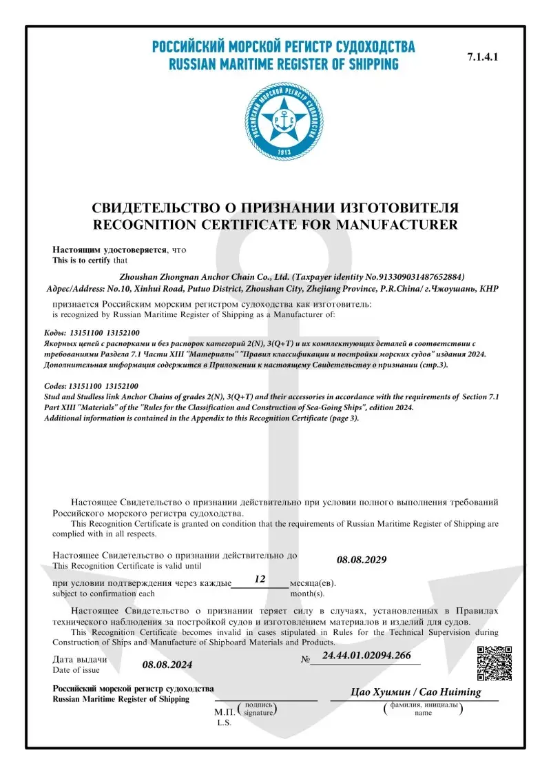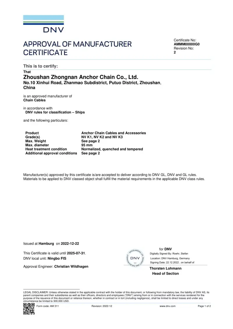 Igen. Az összes horgonylánc -tartozékot ugyanazon nemzetközi szabványoknak megfelelően gyártják, amelyek maguk a horgonyláncokra (ISO, IACS) vonatkoznak, beleértve a CCS, ABS, DNV, LR, BV, NK, KR, Rina és RS jóváhagyásait. Ezek a tanúsítások biztosítják, hogy a kiegészítők megfeleljenek a globális hajógyártók és az offshore operátorok dimenziós pontosságának, biztonságának és mechanikai erősségének követelményeinek.